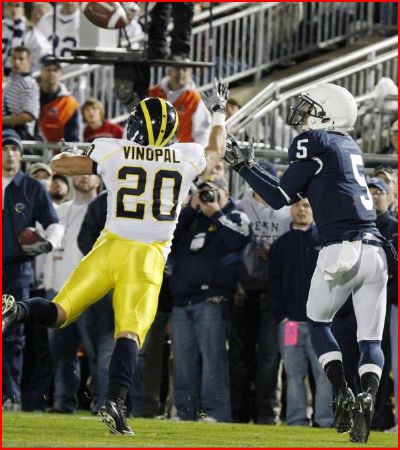 | PSU wide receiver Graham Zug catches a touchdown pass over freshman safety Ray Vinopal. |