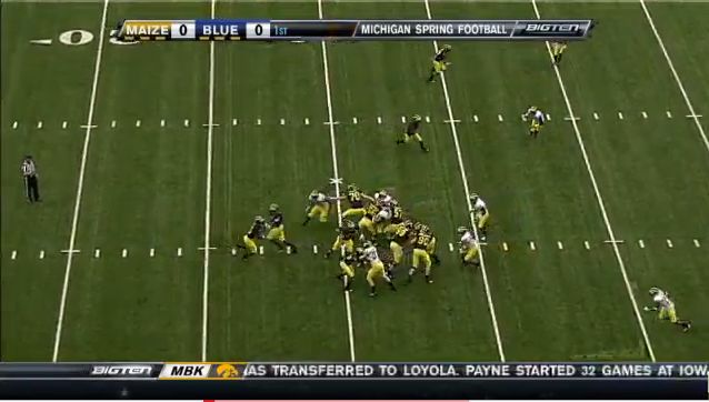 ABOVE: As RB Michael Cox gets the handoff, LT Kristian Mateus whiffs on DE Jibreel Black, who’s totally and completely screwed if this is a rollout pass. HB Ricardo Miller impacts SAM Jake Ryan with LG Rocko Khoury coming to help, while DE Ken Wilkins gets driven off the ball. MIKE Brandon Herron steps up into the developing hole and WILL Brandin Hawthorne (?) flows to the ball. CB Terrence Talbott has started to come up and support while FS Marvin Robinson follows his receiver across the field.